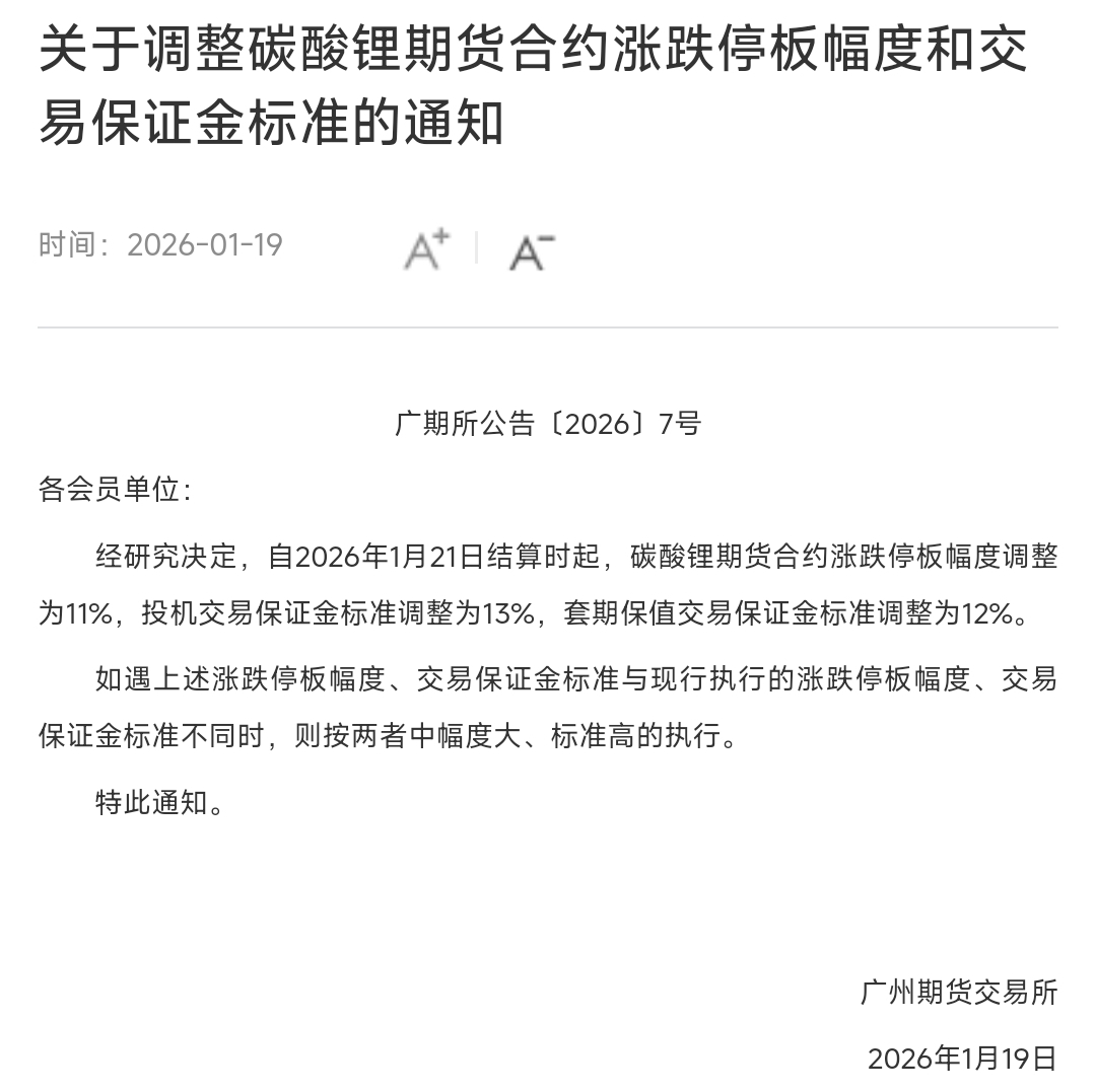 1月19日,广期所发布通知称,自1月21日结算时起,碳酸锂期货合约涨跌停板幅度调整为11%,投机交易保证金标准调整为13%,套期保值交易保证金标准调整为12%。