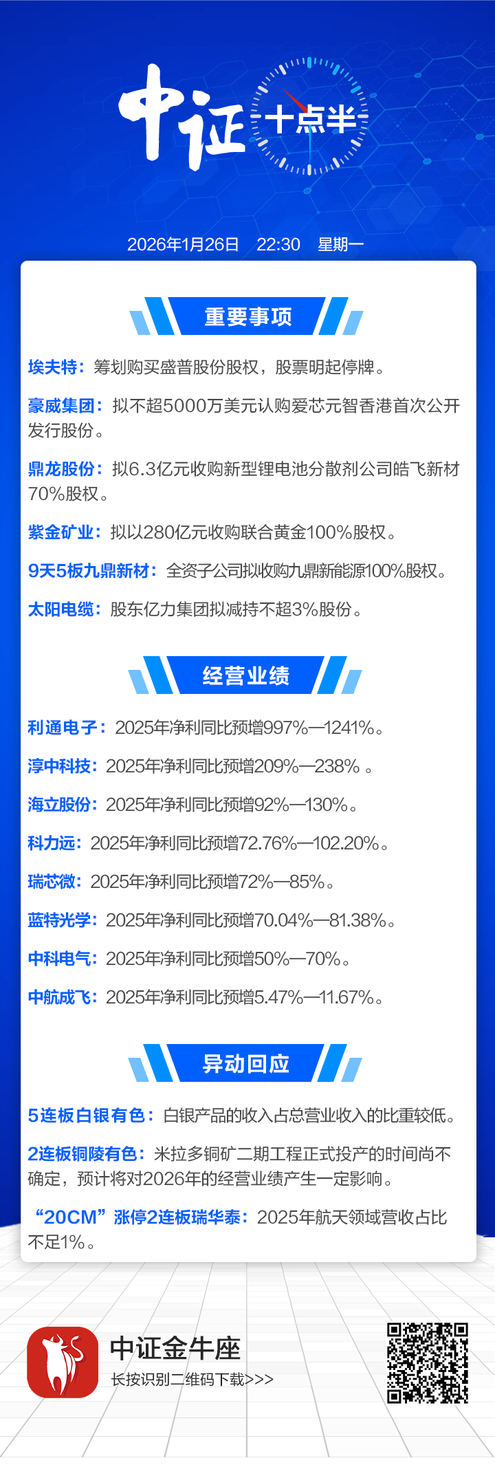 【中证十点半】紫金矿业拟以280亿元收购联合黄金100%股权;多家A股公司业绩预增;埃夫特明起停牌