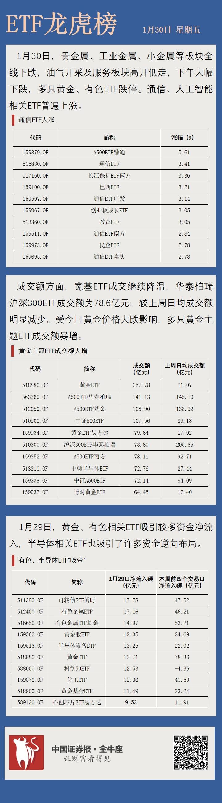 【ETF龙虎榜】通信ETF上涨,黄金、有色ETF跌停