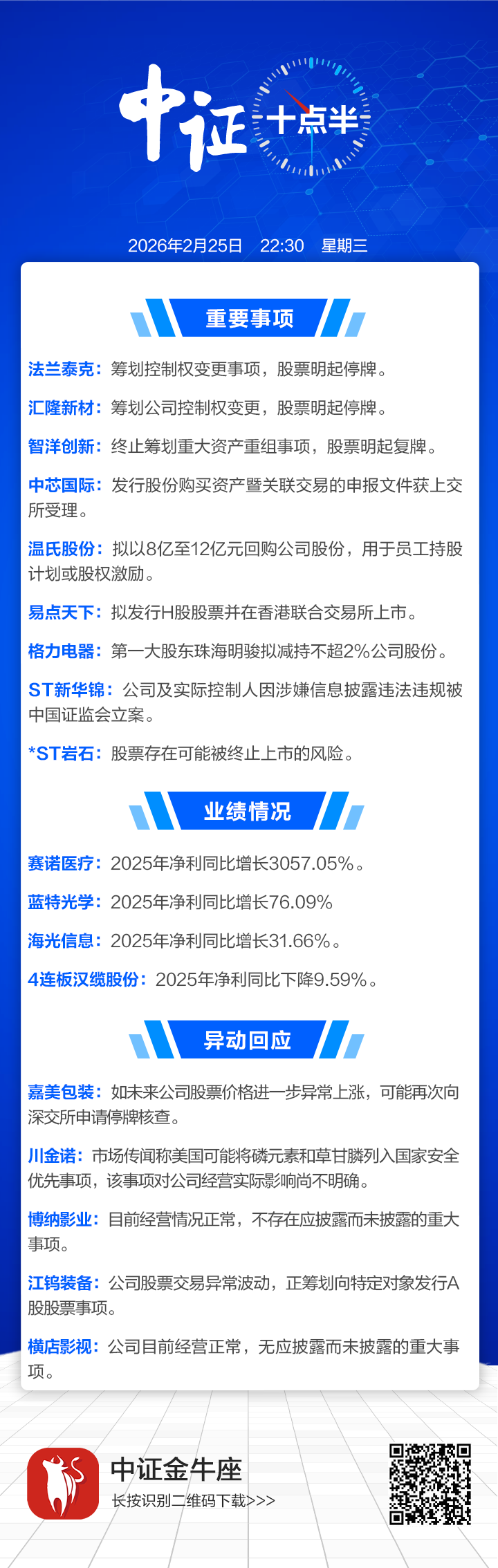 【中证十点半】筹划控制权变更,法兰泰克、汇隆新材明起停牌;赛诺医疗2025年净利同比增长3057.05%