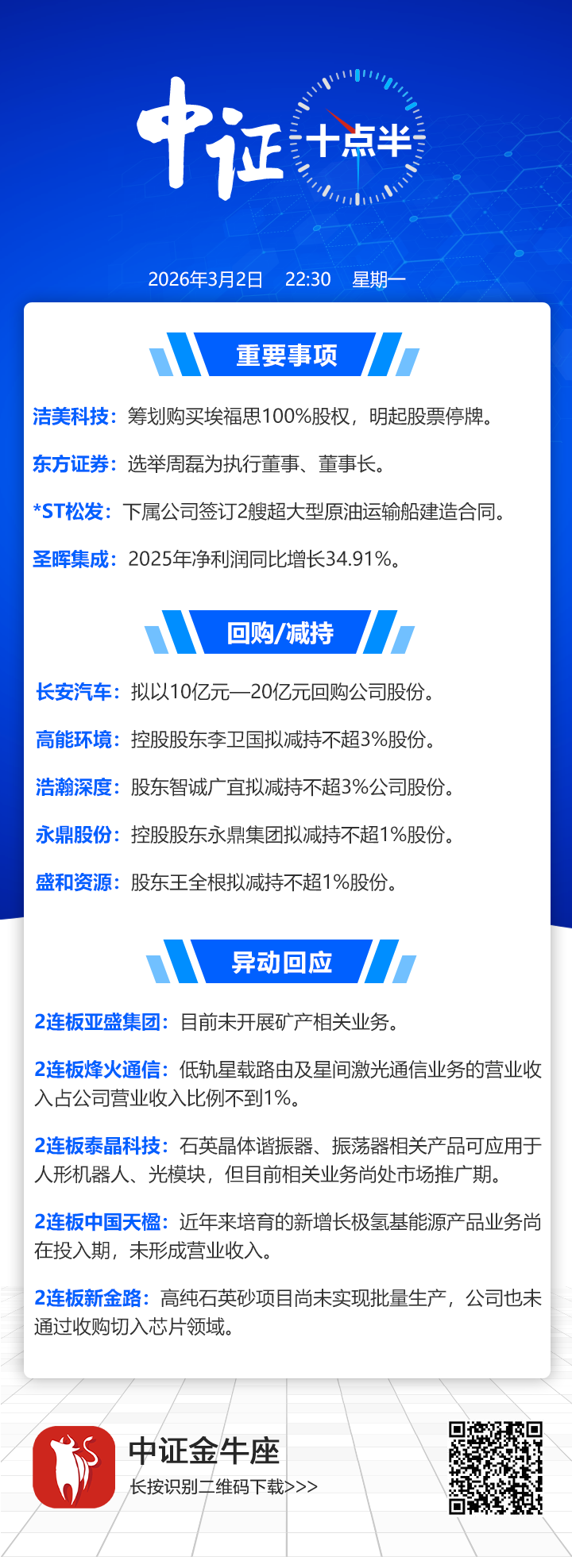 【中证十点半】洁美科技拟购买埃福思100%股权;长安汽车拟回购10亿元—20亿元股份