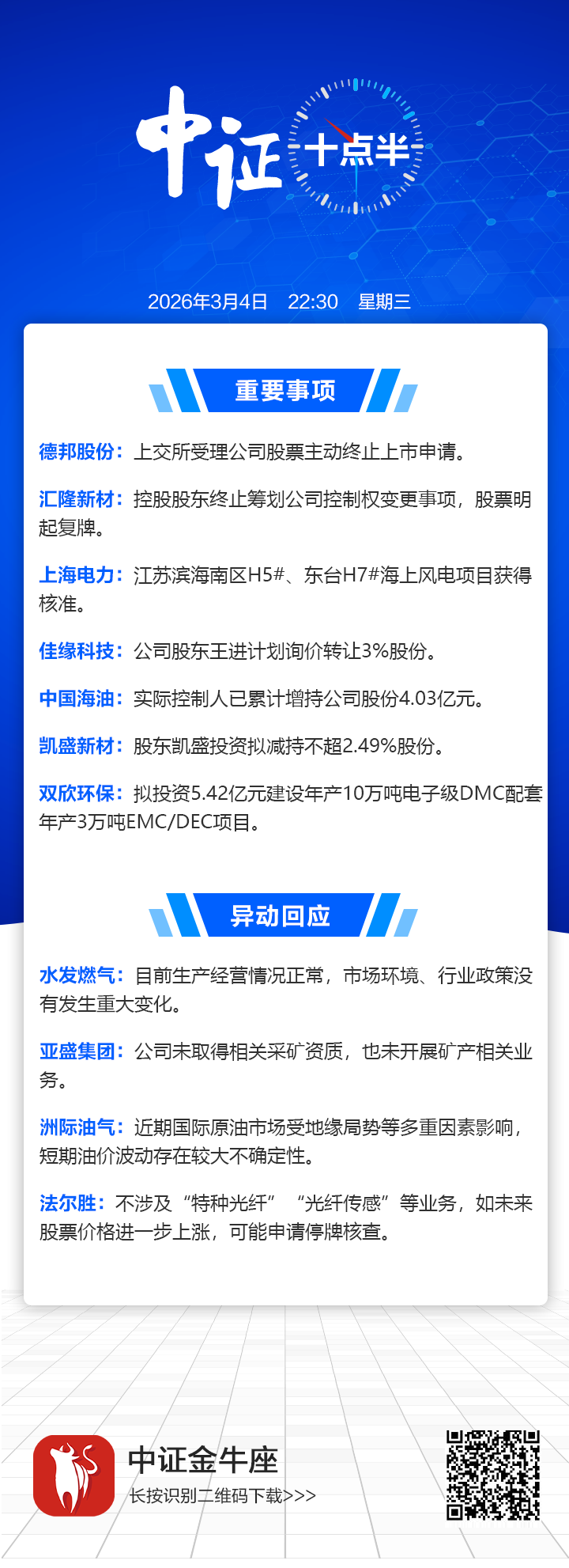 【中证十点半】法尔胜可能申请停牌核查;汇隆新材明起复牌;德邦股份主动退市有新进展