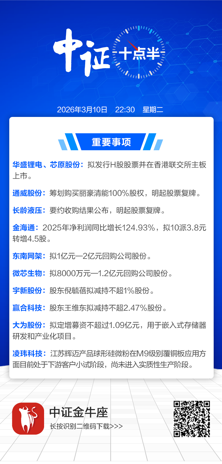 【中证十点半】华盛锂电、芯原股份拟赴港上市;通威股份、长龄液压明起复牌