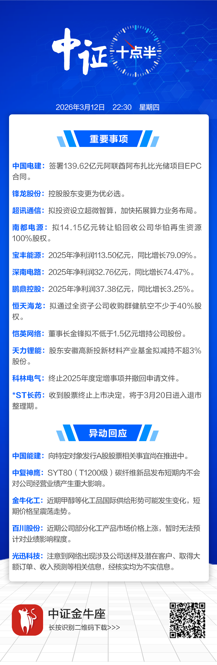【中证十点半】宝丰能源去年净利润大增79.09%;锋龙股份控股股东变更为优必选;*ST长药终止上市