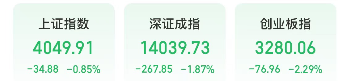 今天,A股调整。截至收盘,上证指数下跌0.85%,深证成指下跌1.87%,创业板指下跌2.29%。