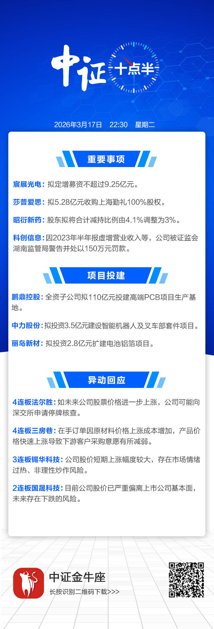 【中证十点半】鹏鼎控股子公司拟110亿元投建高端PCB项目生产基地;昭衍新药股东拟将减持比例下调为3%