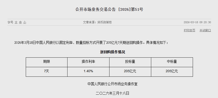 3月18日,中国人民银行以固定利率、数量招标方式开展了205亿元7天期逆回购操作,操作利率为1.40%,与此前持平。因今日有265亿元7天期逆回购到期,实现净回笼60亿元。