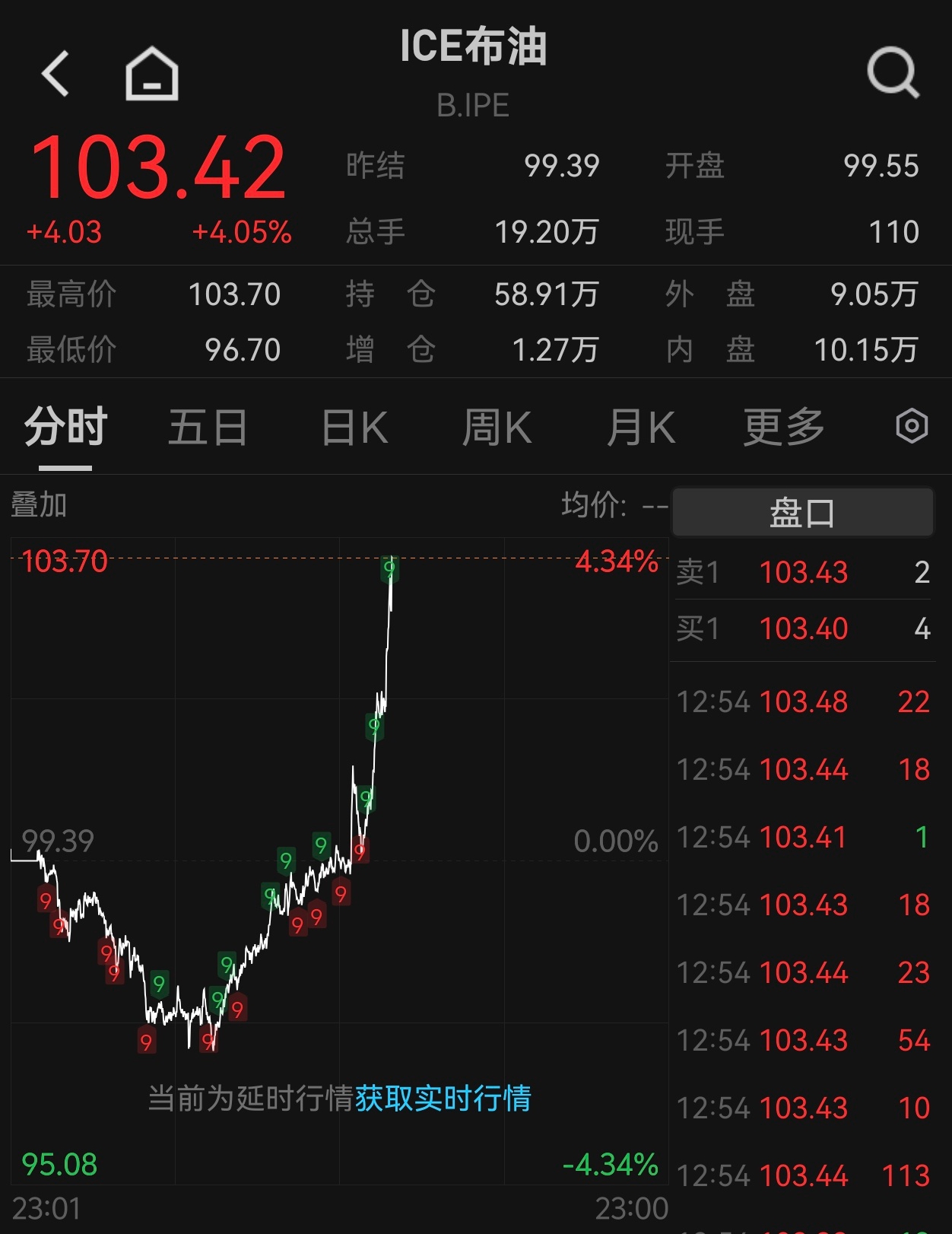 Wind数据显示,截至北京时间3月18日21:10,布伦特原油期货涨4.05%,报103.42美元/桶。
