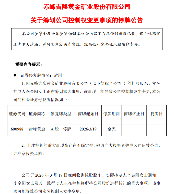 赤峰黄金3月19日公告,公司于2026年3月18日晚间收到控股股东、实际控制人李金阳通知,李金阳及其一致行动人正在筹划将其所持公司股份进行转让的重大事项,该事项可能导致公司实际控制人发生变更。上述事项正在洽谈中,尚存在不确定性。为保证公平信息披露,经公司向上海证券交易所申请,公司股票于2026年3月19日上午开市起停牌,预计停牌时间不超过5个交易日。