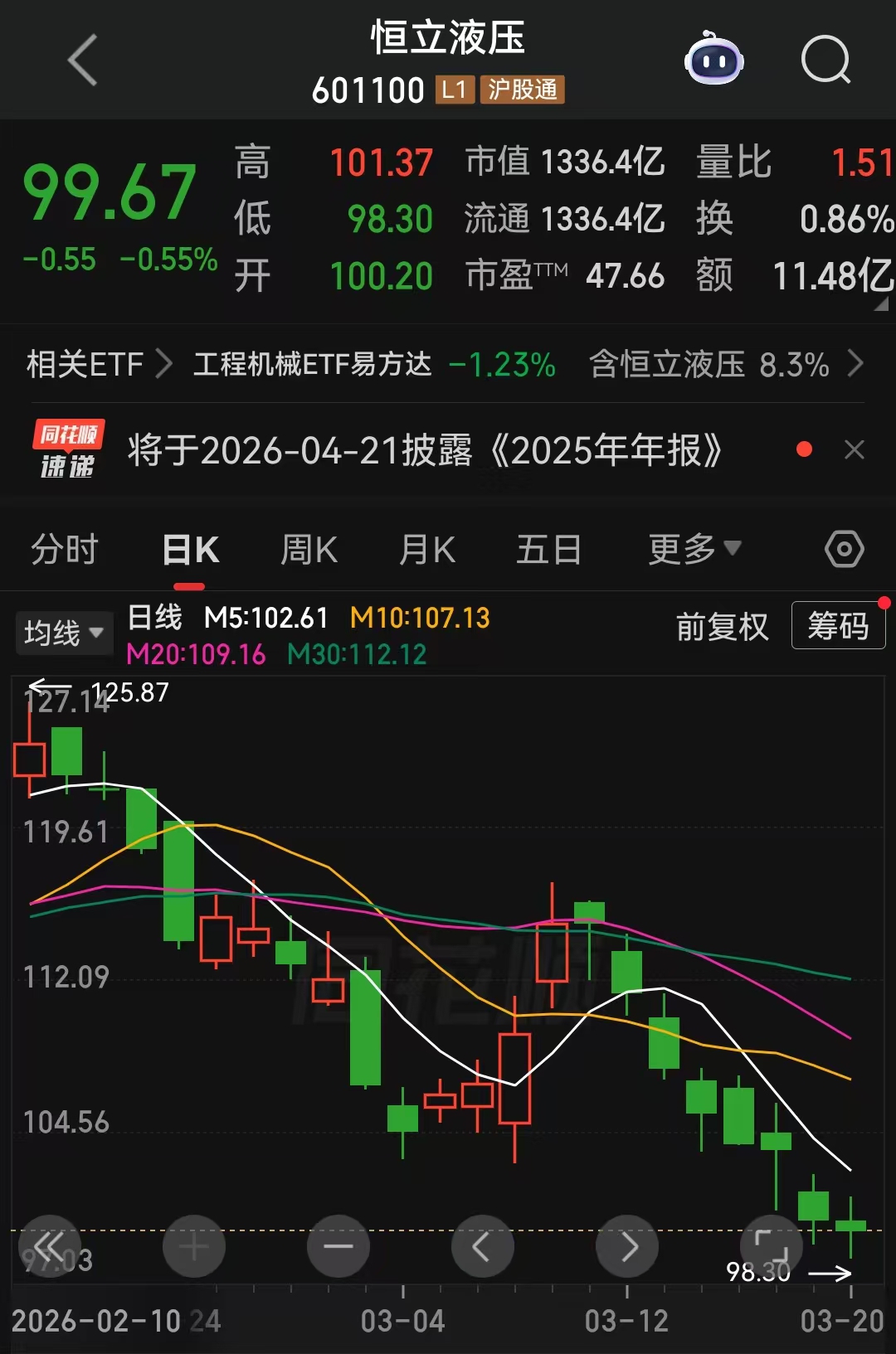 同花顺数据显示,公司股价已是八连阴。截至3月20日收盘,恒立液压报99.67元/股,跌0.55%,总市值为1336亿元。
