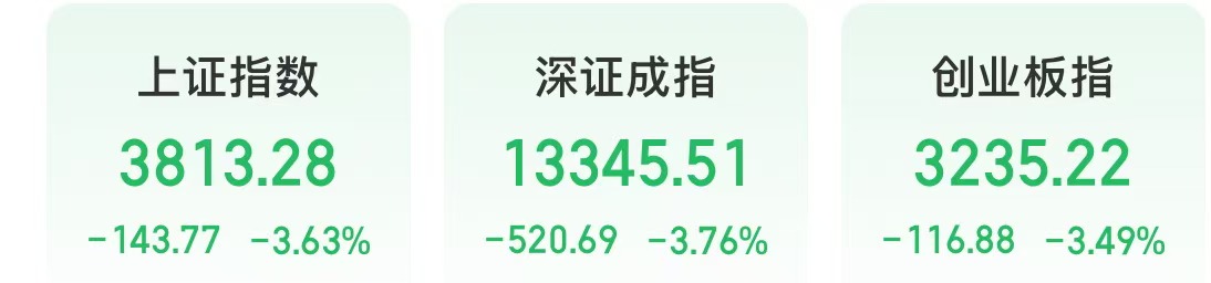今天,A股调整,上证指数盘中跌破3800点,最低跌至3794.68点。截至收盘,上证指数下跌3.63%,报3813.28点,深证成指下跌3.76%,创业板指下跌3.49%。