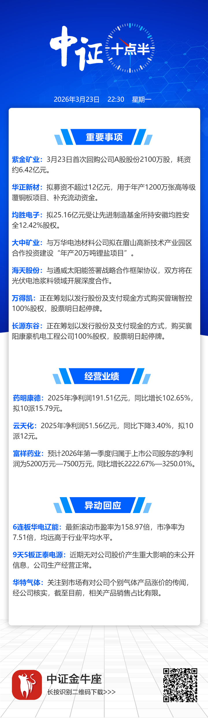 【中证十点半】耗资超6亿元,紫金矿业回购公司A股;药明康德去年净利润增超100%