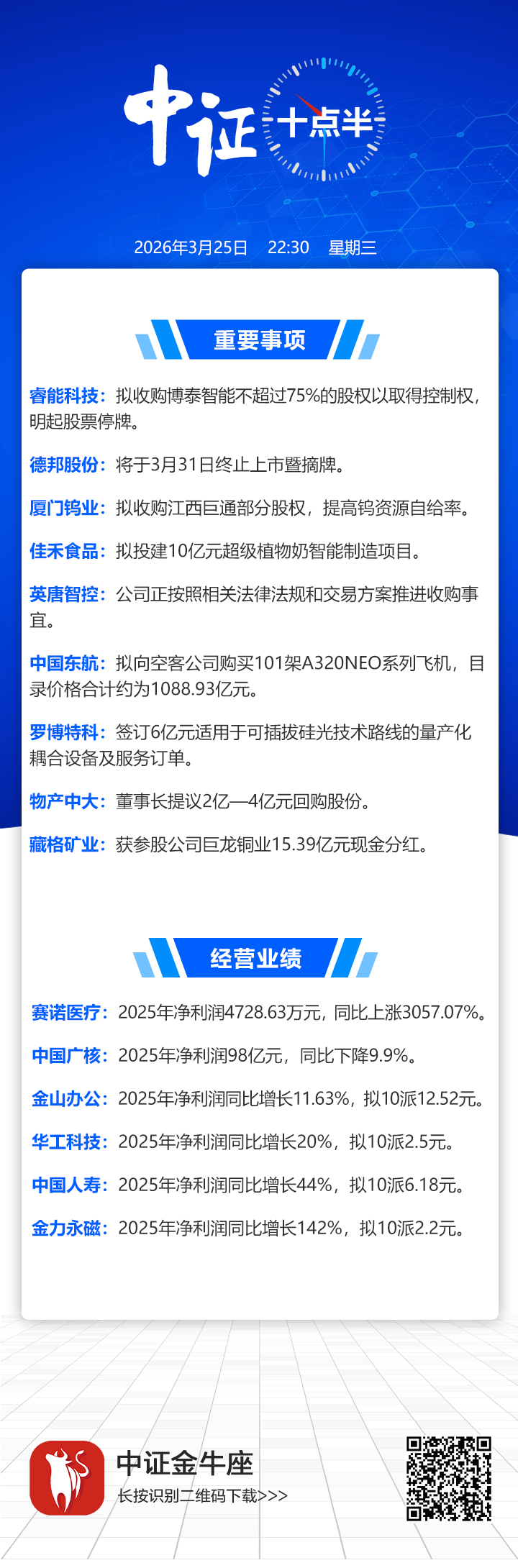 【中证十点半】德邦股份3月31日终止上市;睿能科技明起停牌