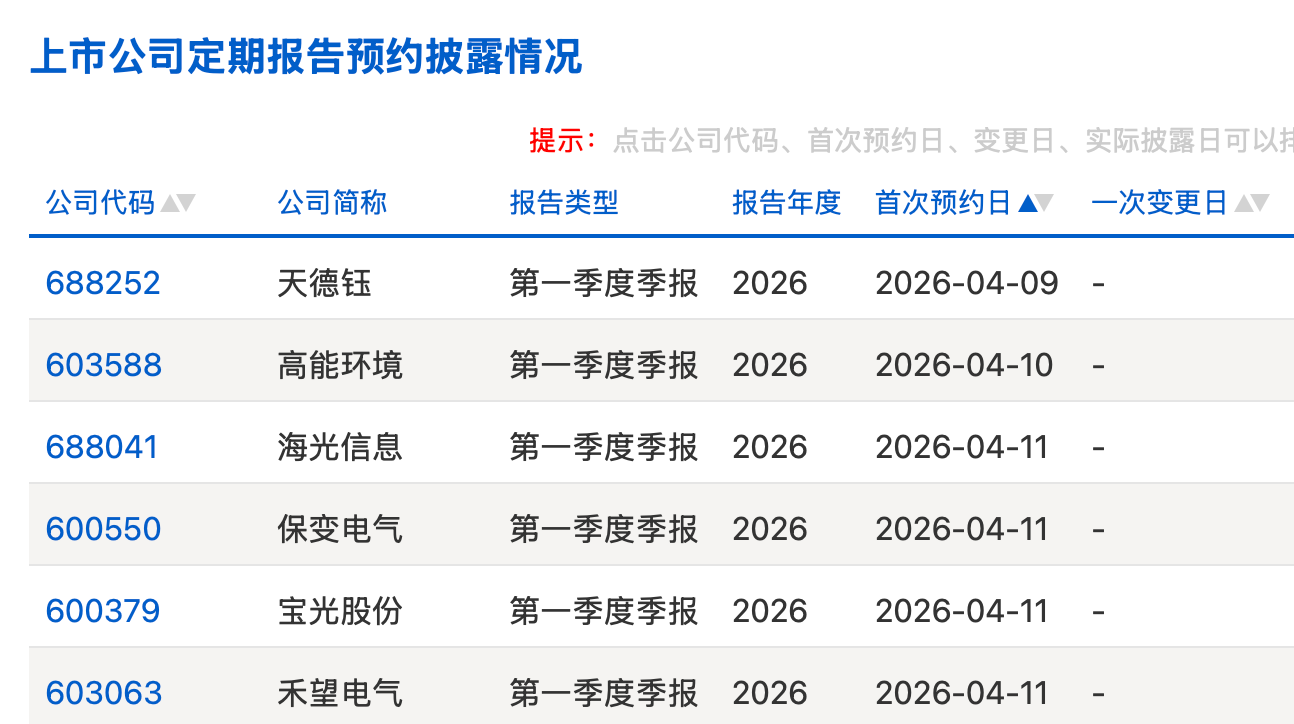 3月26日,中国证券报·中证金牛座记者从上交所网站获悉,沪市上市公司2026年第一季度季报预约披露时间出炉。其中,天德钰将于4月9日率先披露第一季度季报;高能环境紧随其后,将于4月10日披露。海光信息、保变电气、宝光股份、禾望电气均将于4月11日披露一季报。