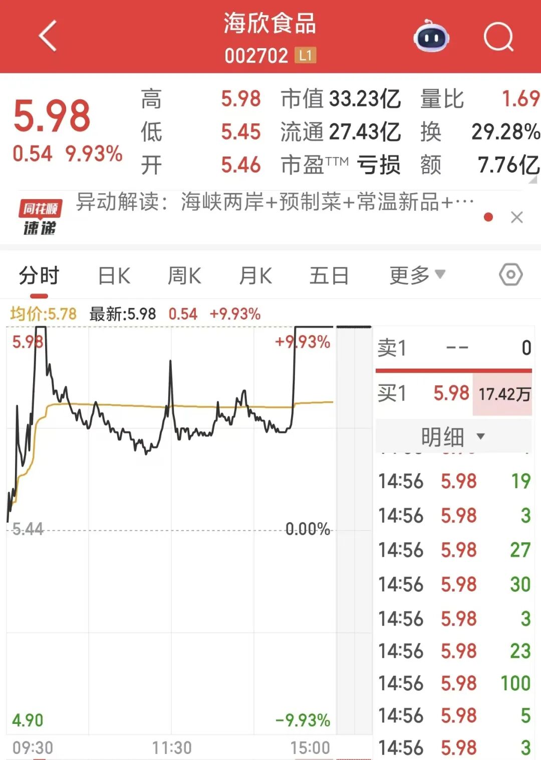 大消费板块尾盘异动拉升,海欣食品涨停,截至收盘封单超17万手。消息面上,工业和信息化部等六部门联合印发《关于增强消费品供需适配性进一步促进消费的实施方案》。