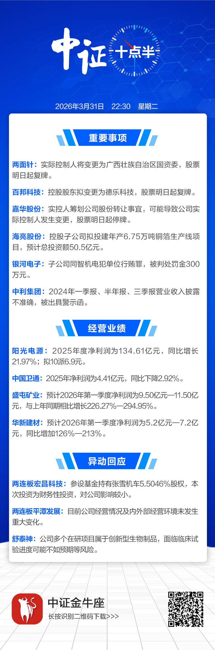 【中证十点半】两面针、嘉华股份等拟变更实控人;宏昌科技回应间接投资“张雪机车”