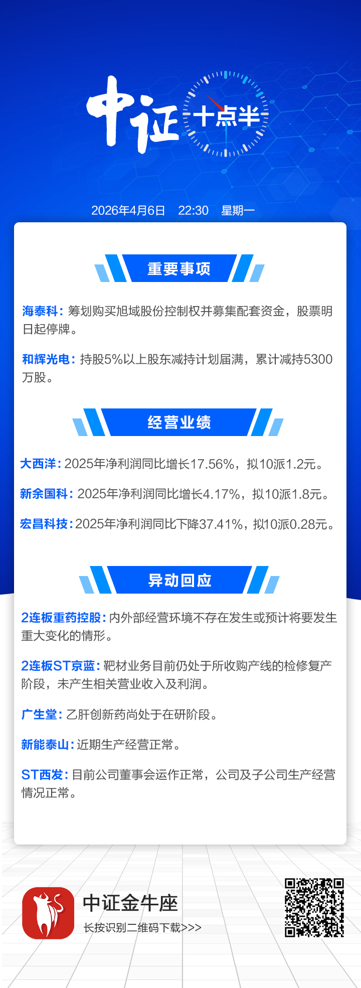 【中证十点半】海泰科拟购旭域股份控制权,明日起停牌;广生堂回应创新药研发进展