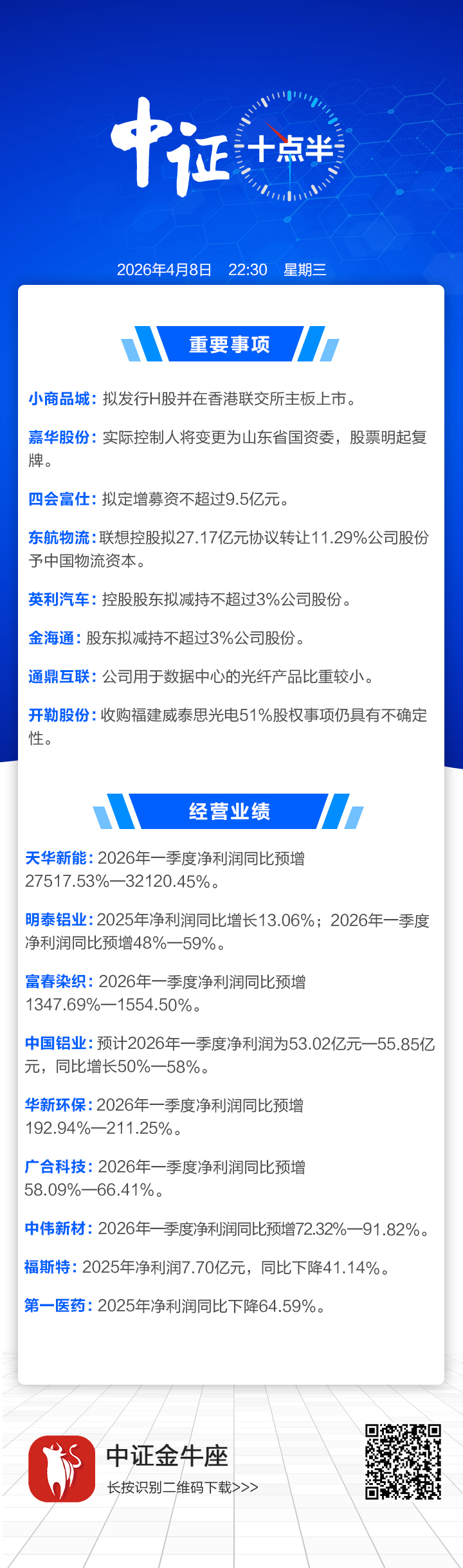 【中证十点半】天华新能一季度净利润预增超270倍;嘉华股份明日复牌;小商品城拟赴港上市