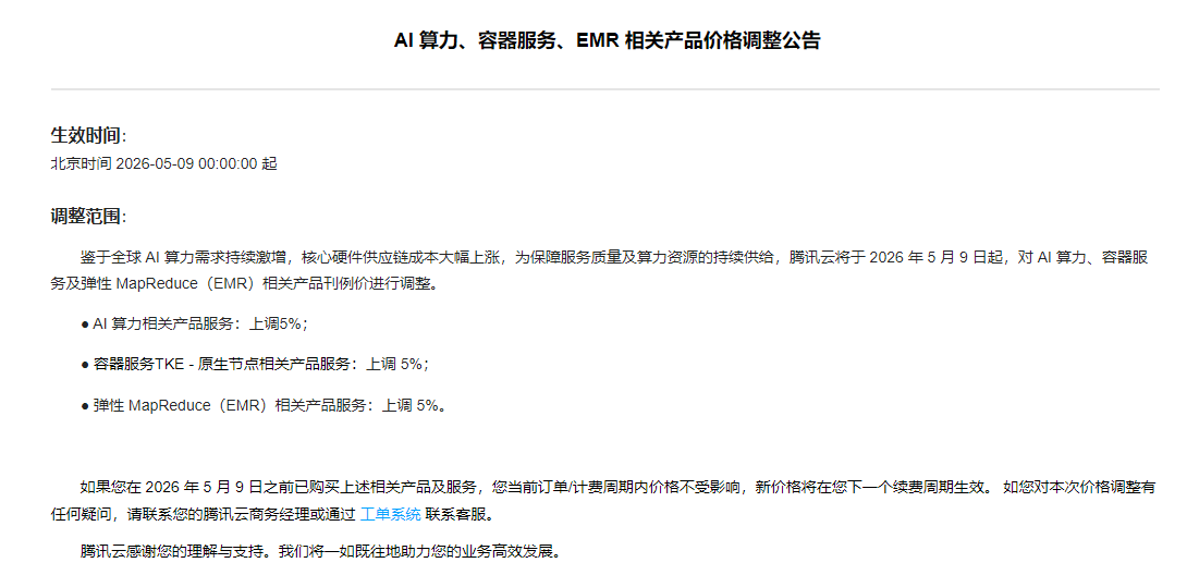 4月9日,腾讯云发布公告称,鉴于全球AI算力需求持续激增,核心硬件供应链成本大幅上涨,为保障服务质量及算力资源的持续供给,腾讯云将于5月9日起,对AI算力、容器服务及弹性MapReduce(EMR)相关产品刊例价进行调整。