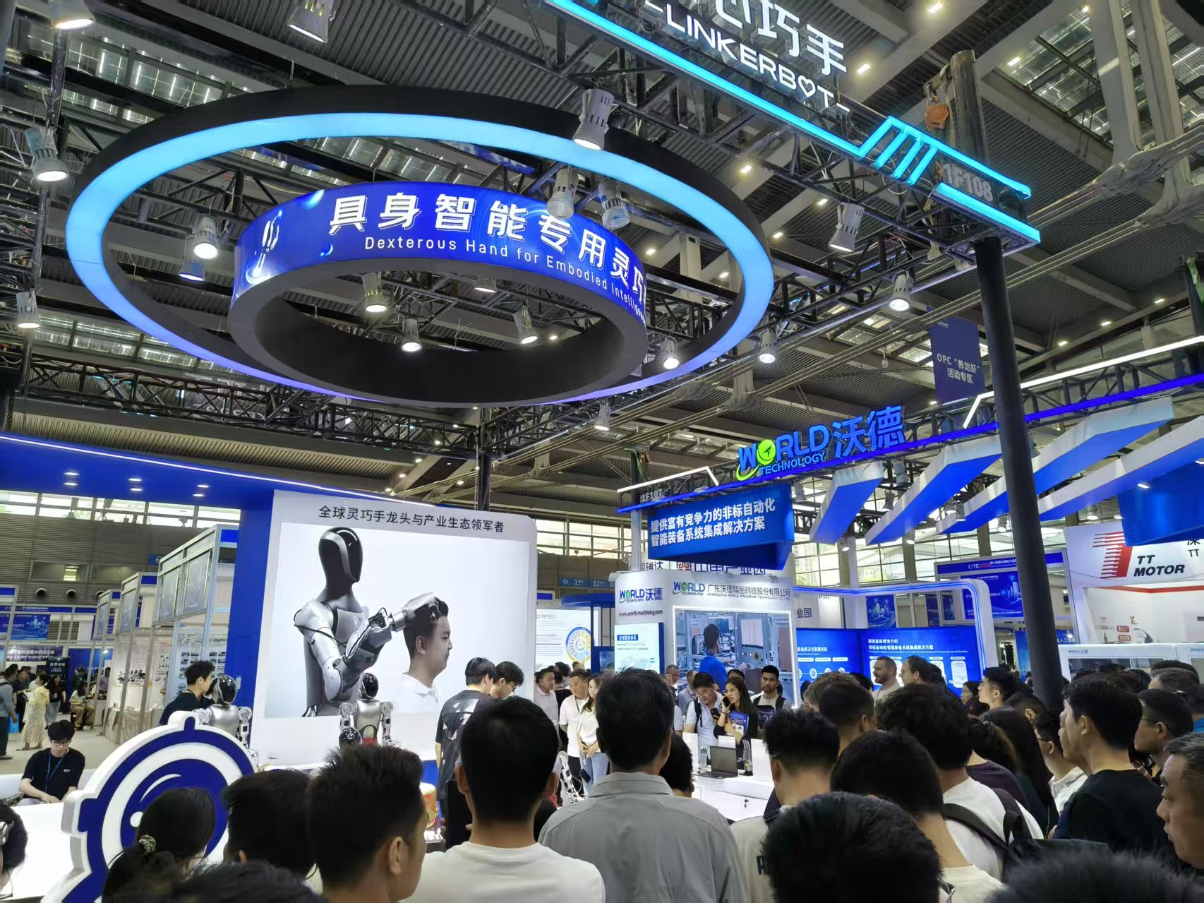 观众在灵心巧手展位观看人形机器人演示弹琴、敲鼓 本报记者 张兴旺/摄