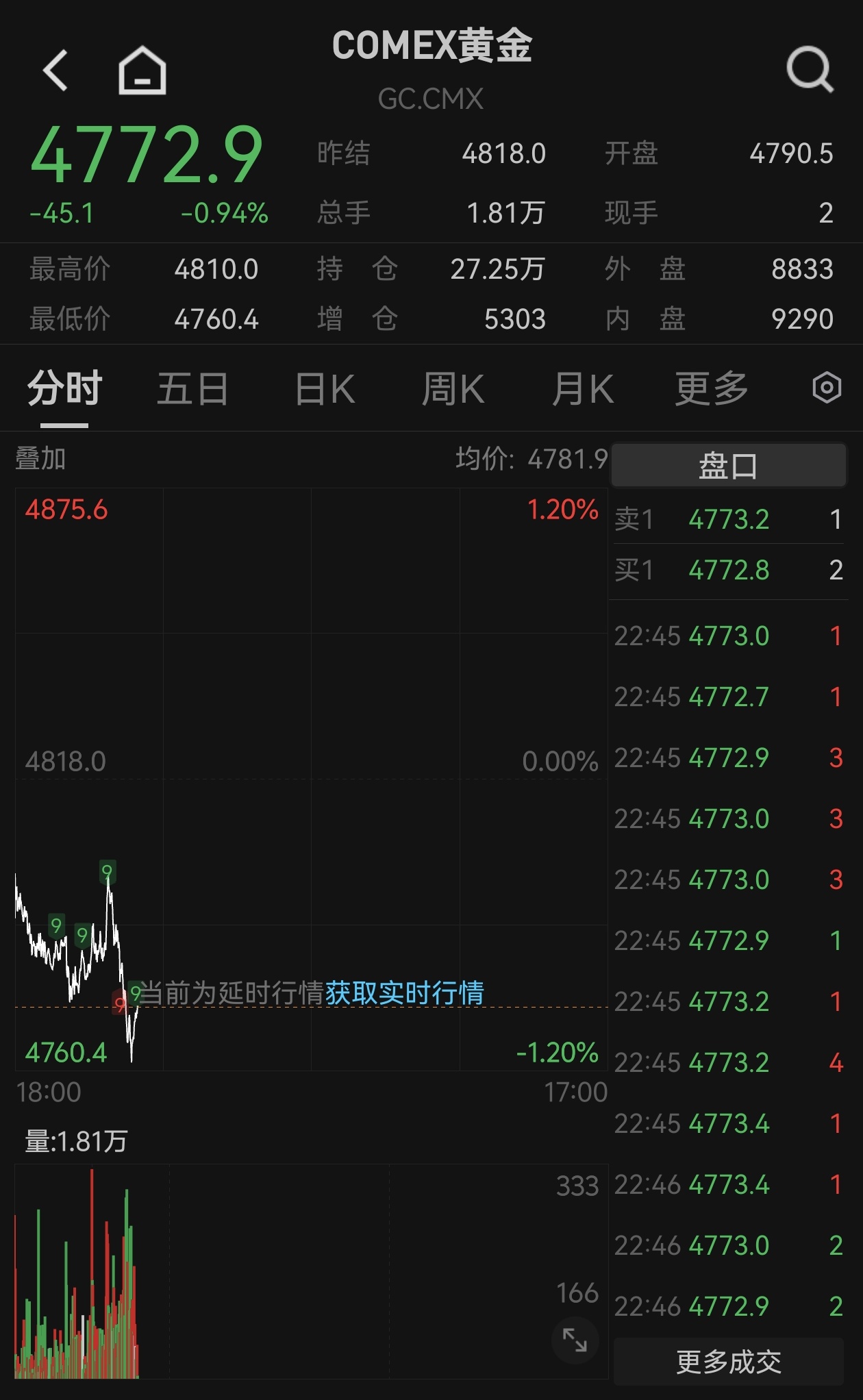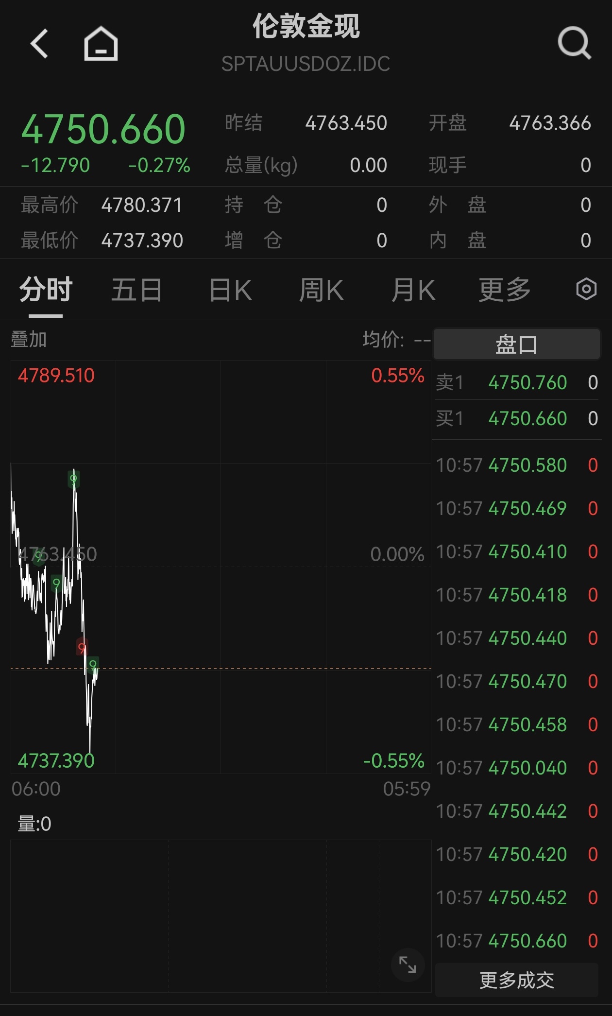 4月10日,现货黄金短线下挫。Wind数据显示,截至10:57,现货黄金下跌0.27%,报4750.66美元/盎司。现货白银失守75美元/盎司,日内跌0.45%。期货方面,截至11:01,COMEX黄金期货跌0.94%,报4772.9美元/盎司。