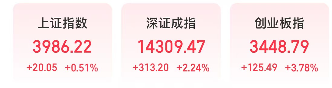 今天,新能源、大金融、科技三大板块联手发力,上证指数盘中重返4000点,创业板指大涨,盘中创2021年12月中下旬以来新高。截至收盘,上证指数上涨0.51%,深证成指上涨2.24%,创业板指上涨3.78%。