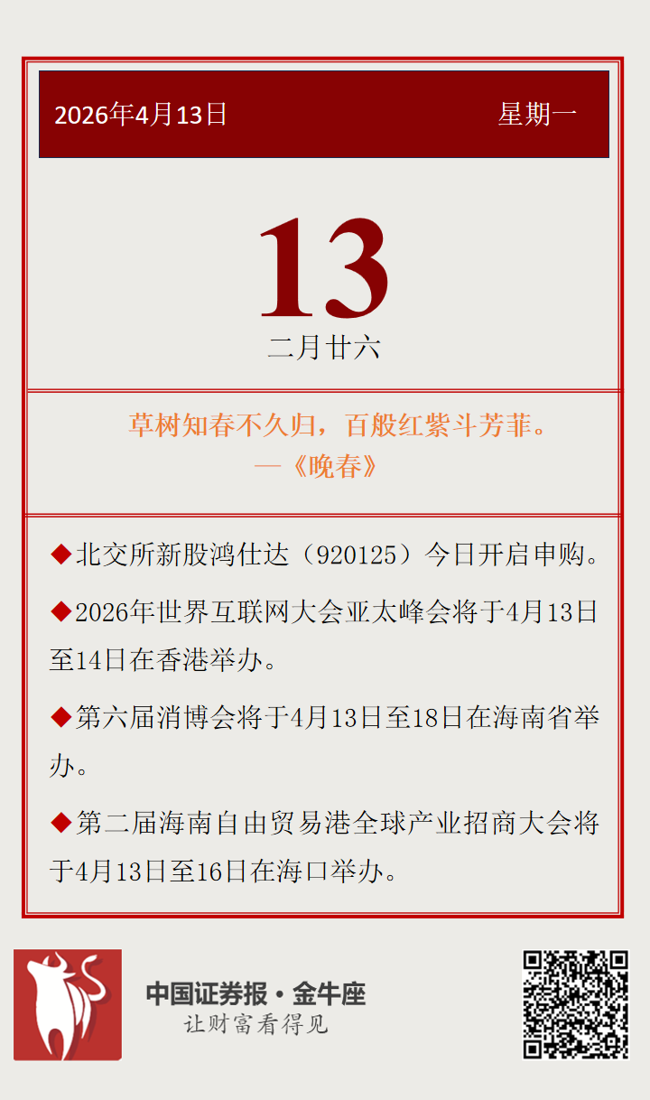 【投资日历】周一(4月13日)资本市场大事