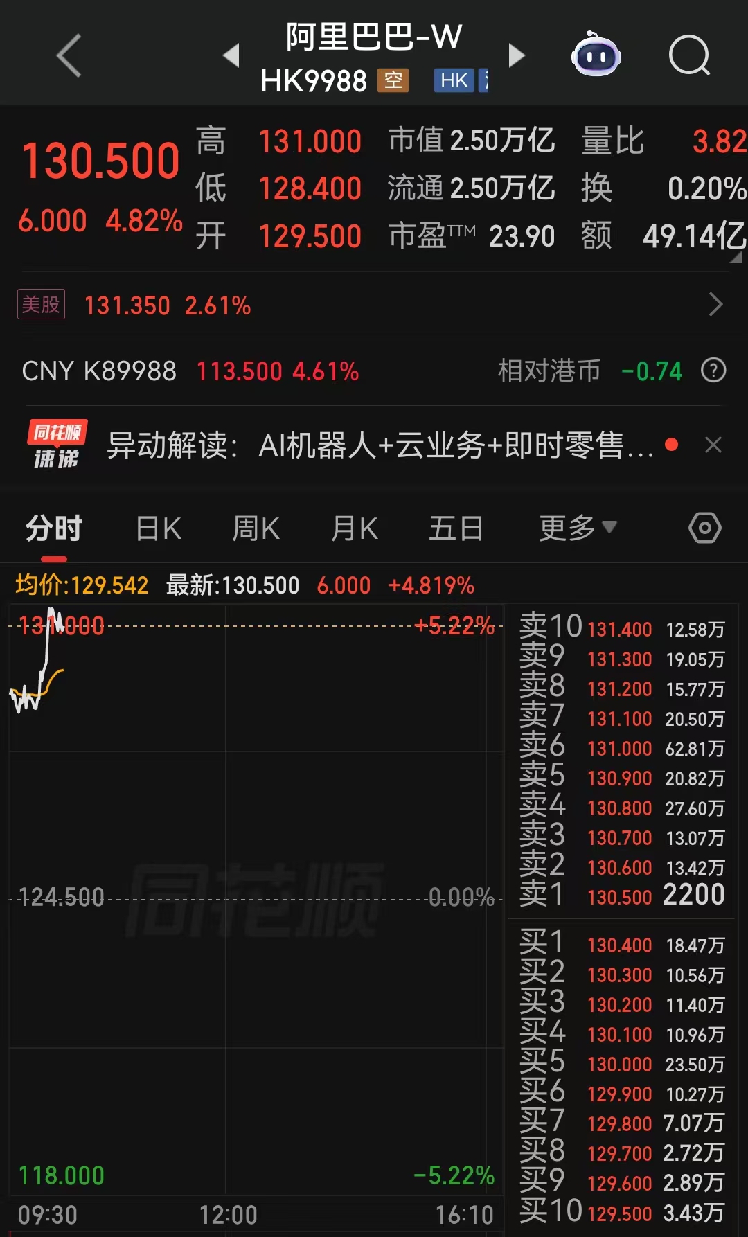 同花顺数据显示,4月15日,港股阿里巴巴股价大幅上涨,盘中一度上涨超5%。截至10:07,阿里巴巴股价涨4.82%,报130.5港元/股。