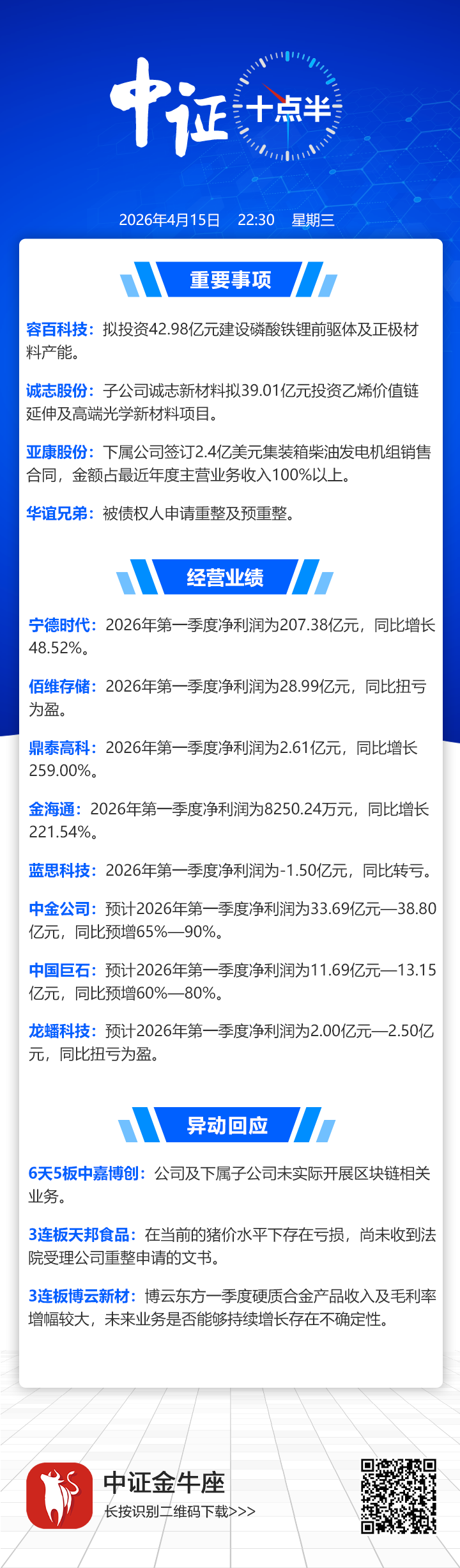 【中证十点半】容百科技拟42.98亿元建设磷酸铁锂前驱体及正极材料产能;华谊兄弟被债权人申请重整及预重整