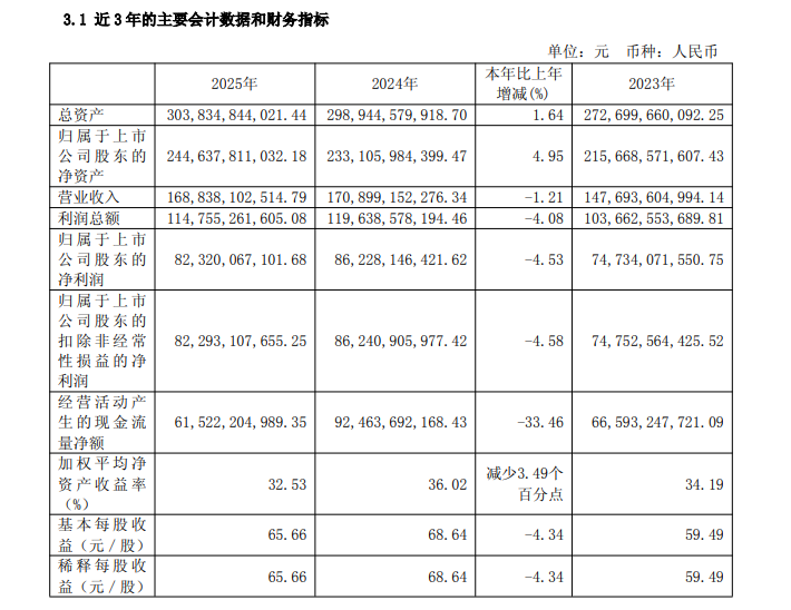 4月16日晚,贵州茅台发布2025年年报。公司全年实现营业总收入1688.38亿元,同比下降1.21%;归母净利润为823.20亿元,同比下降4.53%;扣非后净利润为822.93亿元,同比下降4.58%。Choice数据显示,这是贵州茅台2001年上市以来首次出现年度业绩下滑。