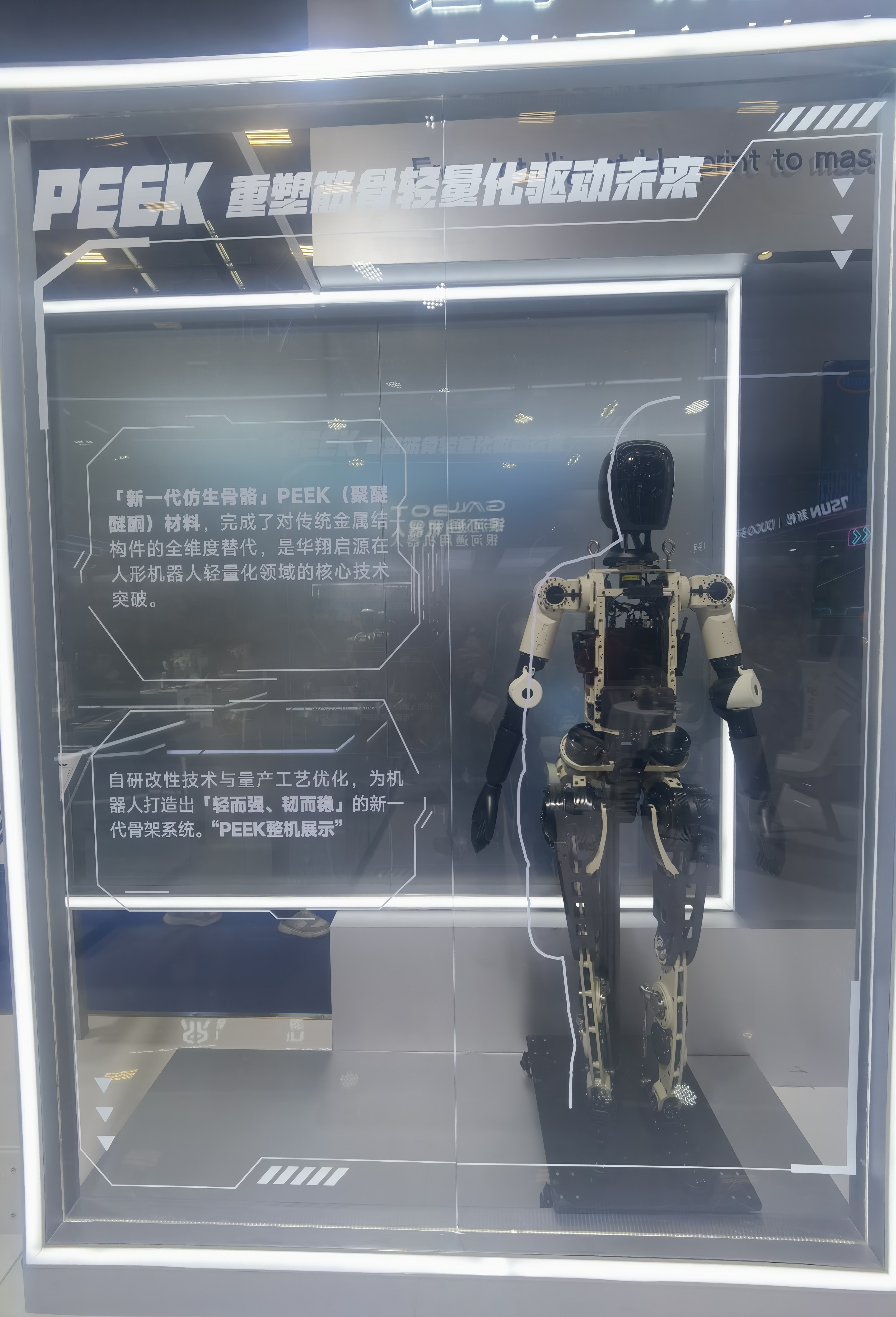 华翔启源通过自建材料研究院,完成从材料改性、工艺优化到整机适配的全链条自主研发,率先实现PEEK材料在全尺寸人形机器人上的应用,为机器人打造了一套轻量化筋骨。