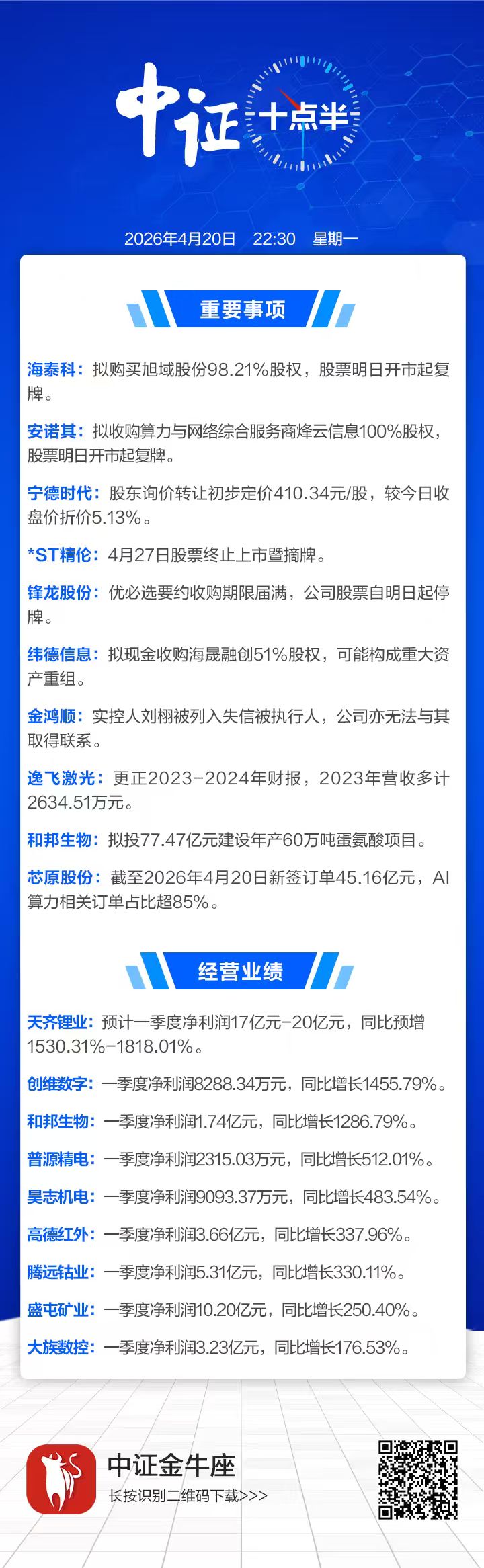 【中证十点半】宁德时代股东询价转让定价出炉;天齐锂业一季度净利预增1530%—1818%;海泰科、安诺其收购资产明日复牌