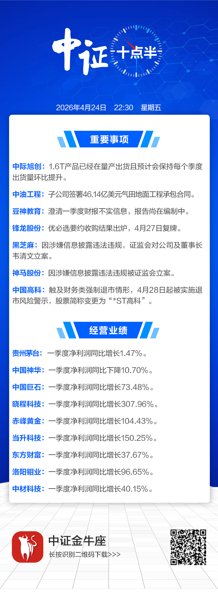 【中证十点半】中际旭创1.6T产品量产;贵州茅台、中国神华一季报出炉