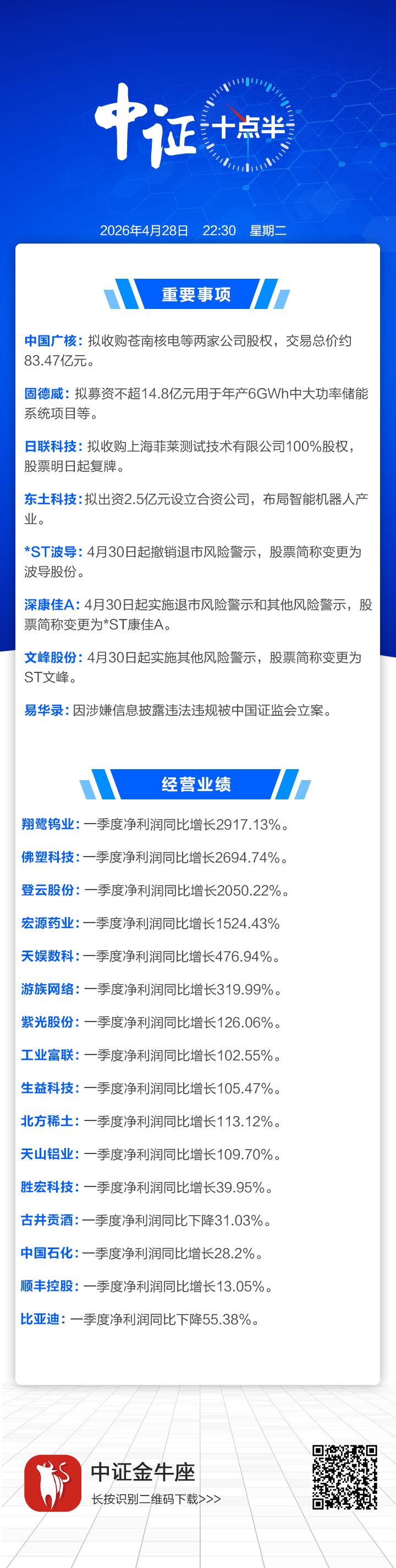 【中证十点半】多家公司一季度净利润大增超20倍;东土科技拟布局智能机器人产业;日联科技明日复牌