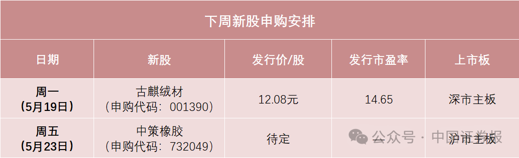 周一(5月19日)可申购深市主板新股古麒绒材,周五(5月23日)可申购沪市主板新股中策橡胶。