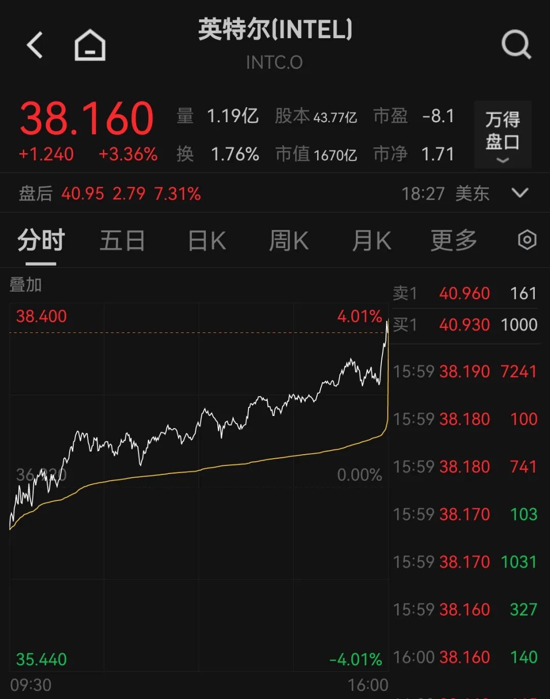 当地时间10月23日,英特尔股价收涨逾3%,总市值回升至1670亿美元,公司盘后股价继续上攻,截至北京时间10月24日6:27,大涨逾7%。