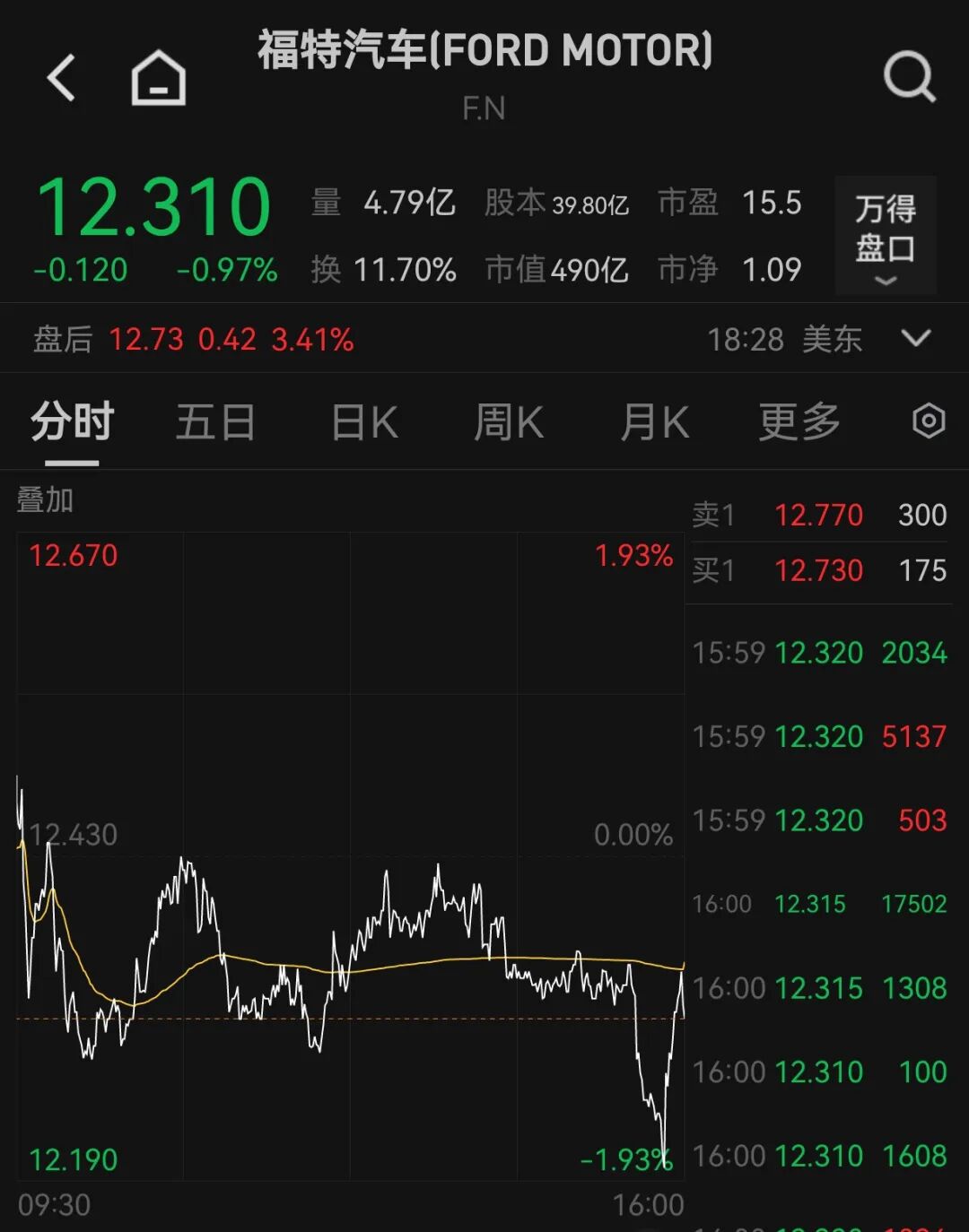 福特汽车收跌近1%。受下调全年调整后息税前利润预期影响,公司盘后股价继续下跌但随后"V型"反弹,截至北京时间10月24日6:28,公司盘后股价大幅反弹,上涨超3%。