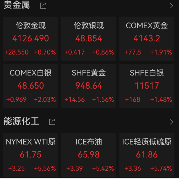 Wind数据显示,当地时间10月23日收盘,COMEX黄金期货价格上涨近2%,报4143.2美元/盎司;伦敦金现货价格上涨0.7%,报4126.49美元/盎司。美国原油期货、布伦特原油期货主力合约双双涨逾5%。