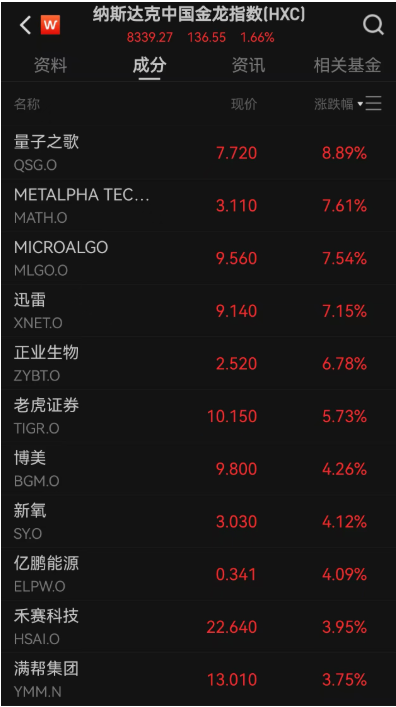 热门中概股多数上涨。截至收盘,纳斯达克中国金龙指数涨1.66%。个股方面,量子之歌涨近9%,迅雷涨逾7%,正业生物涨逾6%,老虎证券涨逾5%。