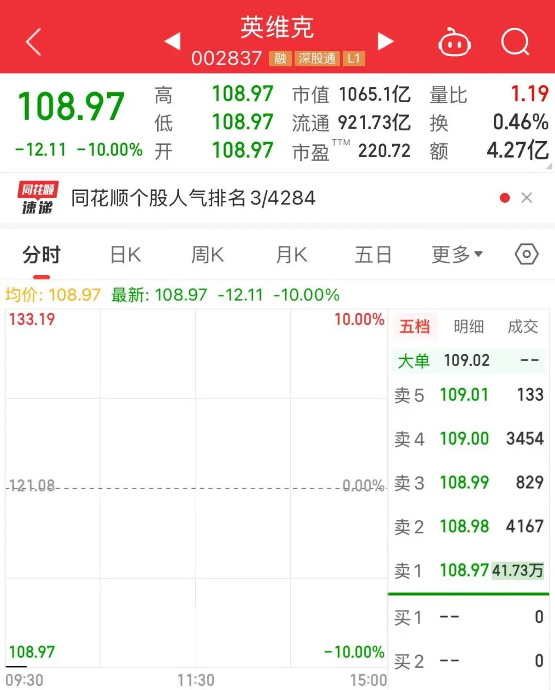 昨天盘中涨停,创出历史新高的液冷大牛股英维克,今天早盘“一”字跌停,截至9:42,跌停板仍有逾41万手封单,最新市值为1065.1亿元。