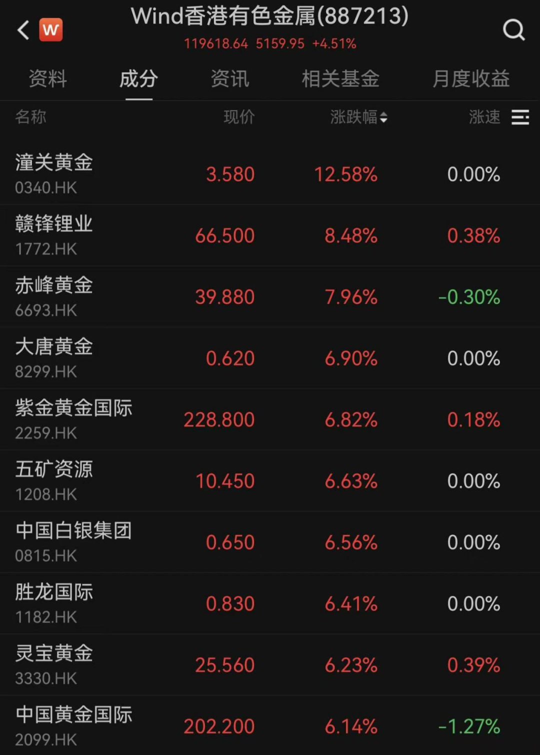 行业板块方面,港股周期资源板块全线回暖,有色金属领涨市场。Wind香港有色金属指数涨4.51%,成分股中,潼关黄金大涨12.58%,赣锋锂业涨超8%,赤峰黄金涨近8%,大唐黄金、紫金黄金国际、五矿资源等涨逾6%。