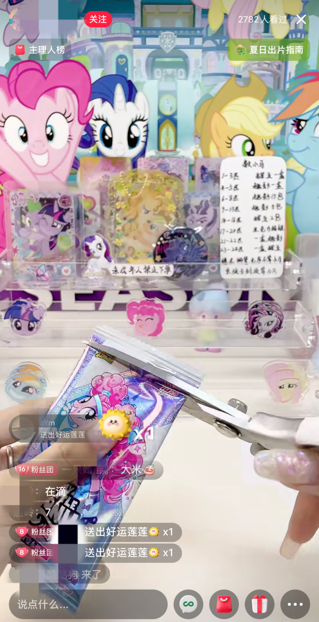 一张桌子,一个置物架,一把剪刀,各种各样的卡牌,构成了一个“拆卡直播间”。拆卡直播,其实就是直播卖卡、主播拆卡、观众围观。这个过程中,印着各类IP角色,根据卡面稀有程度分为不同等级的卡牌,便是拆卡直播间的热销商品。主播甚至不需要露脸,只需重复拆卡的动作,便能吸引上万人在线观看。即使时间已过凌晨,直播间仍有大量观众互动。而这类直播的头部主播,月营业额已经轻松超过百万元。一般来讲,卡牌分为集换式和非集换式两种类型。集换式卡牌可划分为竞技型(TCG)和非竞技型,竞技型卡牌需要玩家组成自己的卡组,在一定规则下与其他玩家对战,代表卡牌游戏为《万智牌》《游戏王》《宝可梦》系列;而非竞技性卡牌的主要价值是收藏和赏玩。直播间拆的卡牌,就属于非竞技型的集换式卡牌。该类卡牌的最大特点,就是结合IP文化进行设计,并以其外观、内容为卖点。目前市面上流行的卡牌,从《奥特曼》《名侦探柯南》到《蛋仔派对》《阴阳师》,再到《小马宝莉》《庆余年》等,涵盖动漫、游戏、电竞、潮玩、影视、综艺、虚拟偶像、文化文旅等,几乎包揽所有IP类型。卡牌厂商会赋予这些卡牌稀有度等级,不过,稀有度等级排序并没有在业内定下统一标准,具体还要以不同卡牌厂商的说明为准。卡牌通常按包出售,这种包装被称为“盲袋”。每包卡牌都有不同的概率,可以抽到不同稀有度的卡。以当下极为流行的小马宝莉卡为例,包括趣影、彩虹、辉月、暮光等多种包装,每包售价从2元至10元不等,卡牌还分为R、SR、SSR等不同等级。有网友调侃:“一代人有一代人的破烂”。卡牌远低于手办的价格,却有着一样抽盲盒式的玩法,迅速替代了曾经火爆的盲盒手办,晋升为这届年轻人的新“顶流”。《2023年中国收藏卡市场研究报告》显示,2022年,中国收藏卡行业市场规模超过100亿元,预计到2025年,这一市场的规模将达到276.6亿元。在抖音直播间,头部卡牌公司卡游在2024年上半年的销售额达到2.78亿元,比2023年全年高了近2亿元,排名仅次于泡泡玛特。消费者方面,数据显示,2022年,中国收藏卡消费者规模433.3万人,同比增长37.8%。基于体育、动漫、影视、音乐领域庞大的粉丝基础,未来几年,国内收藏卡的消费者规模仍将保持高速增长。卡牌玩家群体有一套自己的“术语”。购买卡包叫“抽卡”,拆开卡包叫“拆卡”。有人会为了加大抽中的概率,选择购买一整个卡盒,而这被称为“端盒”。相较于自己买卡来拆,直播拆卡则充满了仪式感。这个夏天,直播拆卡一跃成为直播界新宠,在小红书搜索“直播拆卡”,相关笔记数已经超过5万篇。在直播间,用户可以购买卡牌,主播会提供代拆服务,并将拆卡的过程展示出来,让用户体验拆盲盒的快感。卡牌拆后会被装回原盒,然后寄给用户。主播也会带来充足的情绪价值。如果拆到“爆款”,主播会大喊“恭喜老板”,评论区也会立刻沸腾,有人羡慕,有人祝贺,还有人刷屏“吸欧气”。有网友称,“看别人花钱,我体验拆卡的快乐”。而对于选择在直播间买卡让主播代拆的用户来说,或许只为分享纯粹的快乐,年轻人在这里,找到了久违的归属感。值得一提的是,由于这类直播间商品的特殊性质,用户拍下即是默认让主播代拆,基本上不存在有退换货的订单。这让商家节省了一笔售后投入的同时,到手的实际利润也更为客观。实际上,拆卡直播间的人气表现、直播间销售额上都有着不错的表现。据飞爪数据,以抖音高人气直播间九欧拆卡为例,近30天内,九欧拆卡累计直播15场,直播销售额100万-250万元。潮流消费,是两极分化的市场,参与其中的人觉得物超所值,万物皆可炒,置身局外的人只觉得是“智商税”。