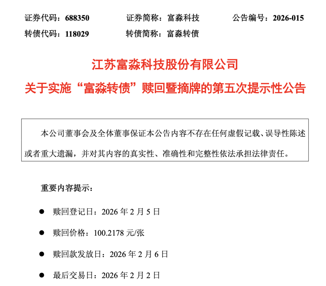 2月2日为“富淼转债”最后一个交易日,2月5日为“富淼转债”最后一个转股日。投资者所持可转债除在规定时限内通过二级市场继续交易或按照18.60元/股的转股价格进行转股外,仅能选择以100元/张的票面价值加当期应计利息(即100.2178元/张)被强制赎回。