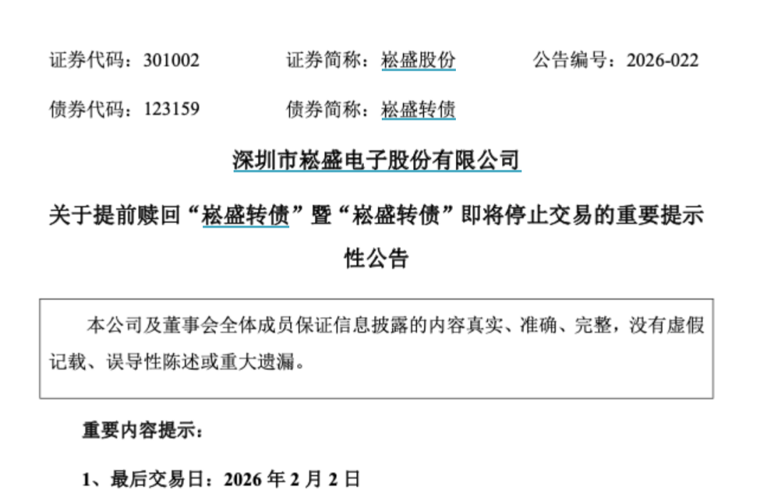 2月2日为“崧盛转债”最后一个交易日,当日“崧盛转债”简称为“Z崧转债”;2月2日收市后“崧盛转债”将停止交易。2月5日为“崧盛转债”最后一个转股日,当日收市前,持有“崧盛转债”的投资者仍可进行转股,2月5日收市后,未实施转股的“崧盛转债”将停止转股,剩余可转债将按照100.54元/张的价格被强制赎回。