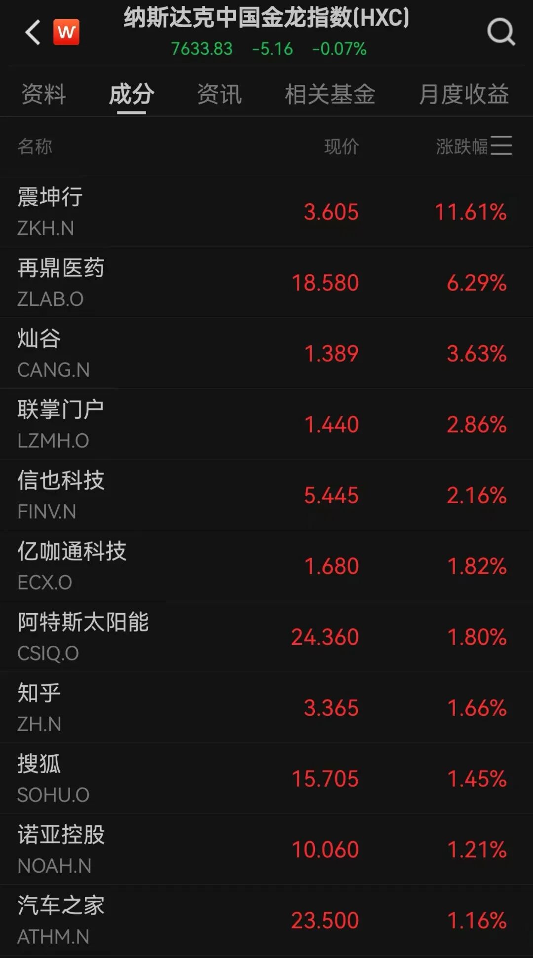 热门中概股隔夜涨跌不一,纳斯达克中国金龙指数微跌0.07%。成分股中,再鼎医药涨逾6%,信也科技涨逾2%,阿特斯太阳能涨近2%,霸王茶姬跌近2%,金山云、好未来双双跌逾1%。