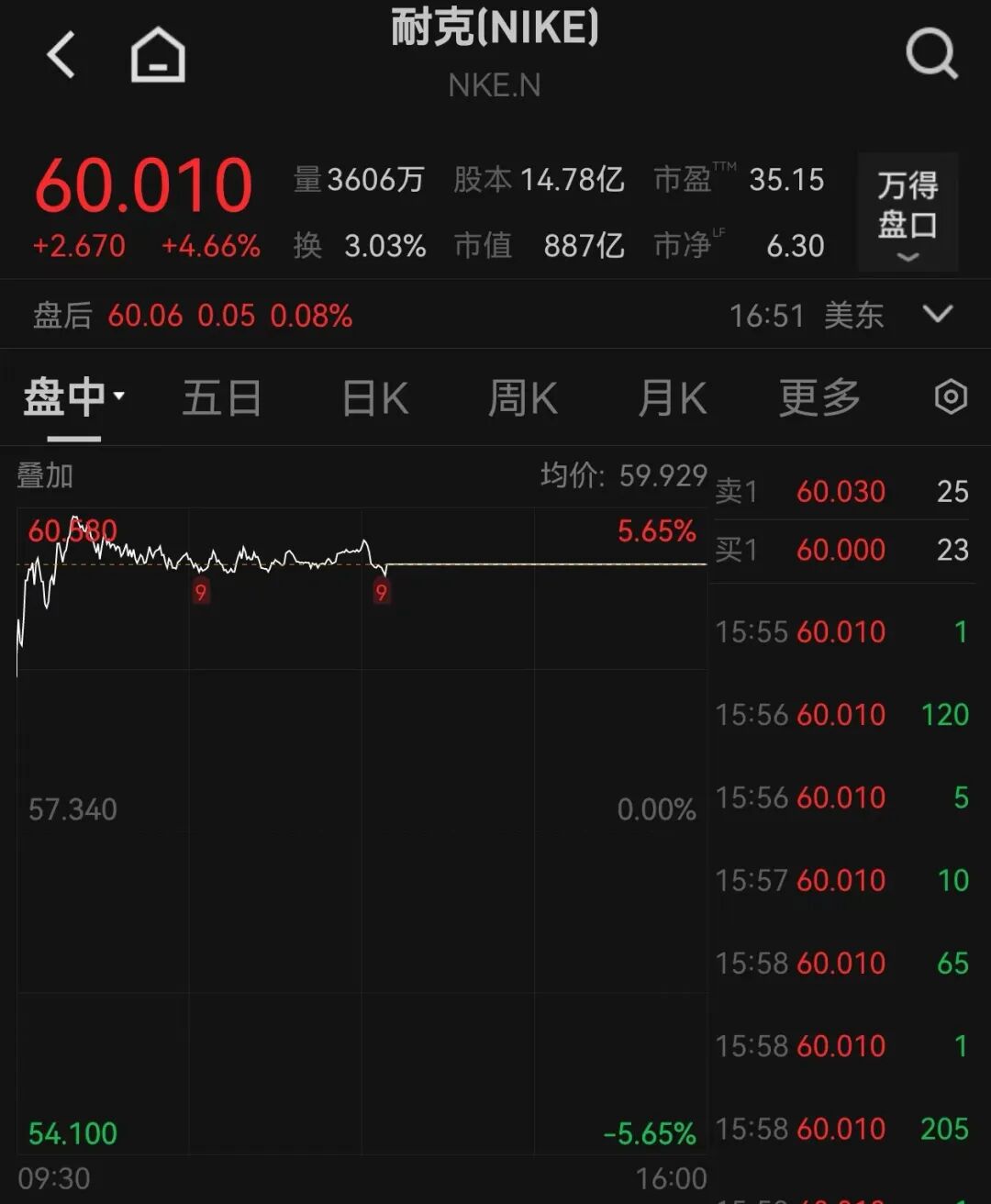 SEC网站信息显示,库克于当地时间12月22日以每股58.97美元的价格增持了5万股耐克股票,增持金额接近300万美元。受此消息提振,截至当地时间12月24日收盘,耐克股价上涨4.66%,总市值报887亿美元。