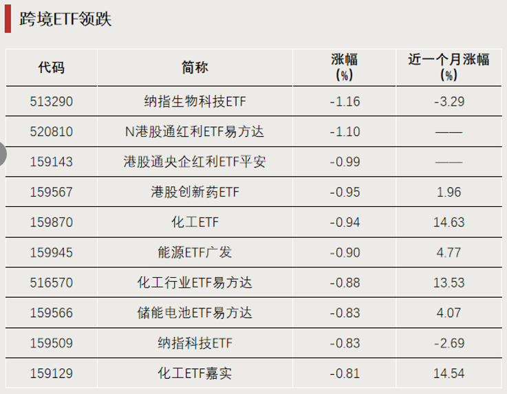跨境ETF今天领跌,纳指生物科技ETF、N港股通红利ETF易方达均跌超1%,在投资A股的ETF中,多只化工相关ETF跌幅居前。