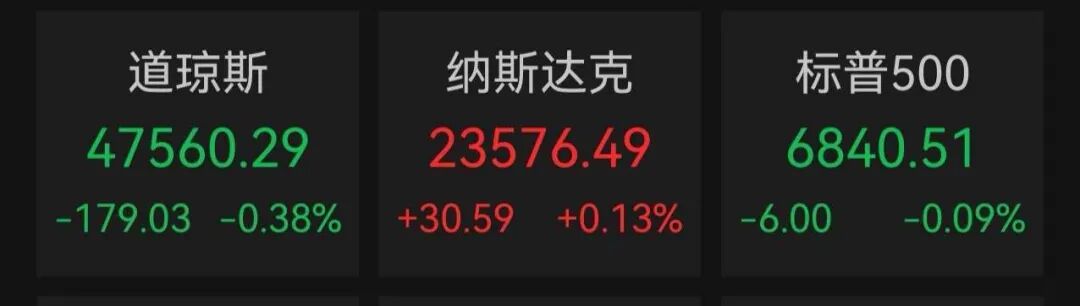 当地时间12月9日,美股三大股指收盘涨跌不一。Wind数据显示,截至收盘,道指跌0.38%,报47560.29点;标普500指数跌0.09%,报6840.51点;纳指涨0.13%,报23576.49点。