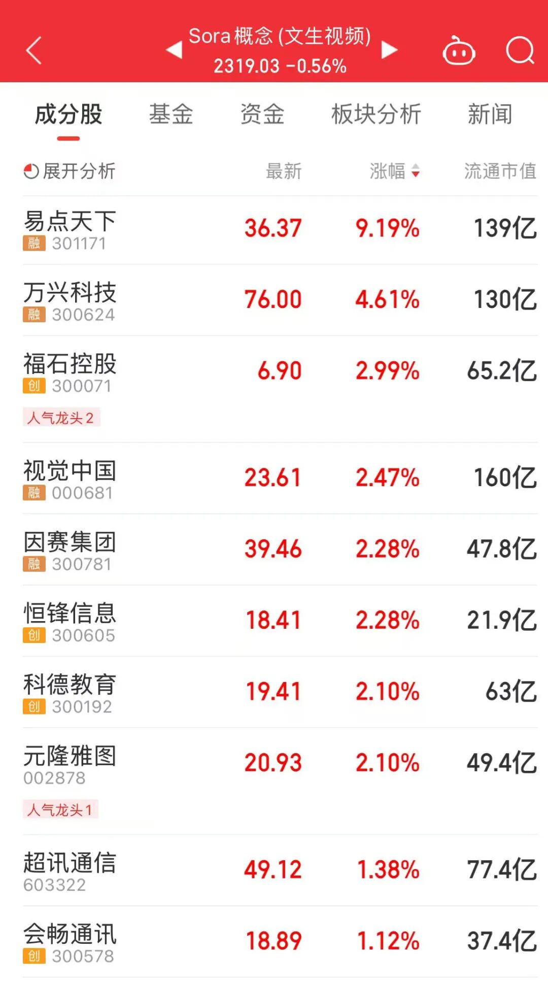 今天上午,AI应用表现活跃,Sora概念盘中冲高,易点天下、万兴科技、福石控股等个股上涨。