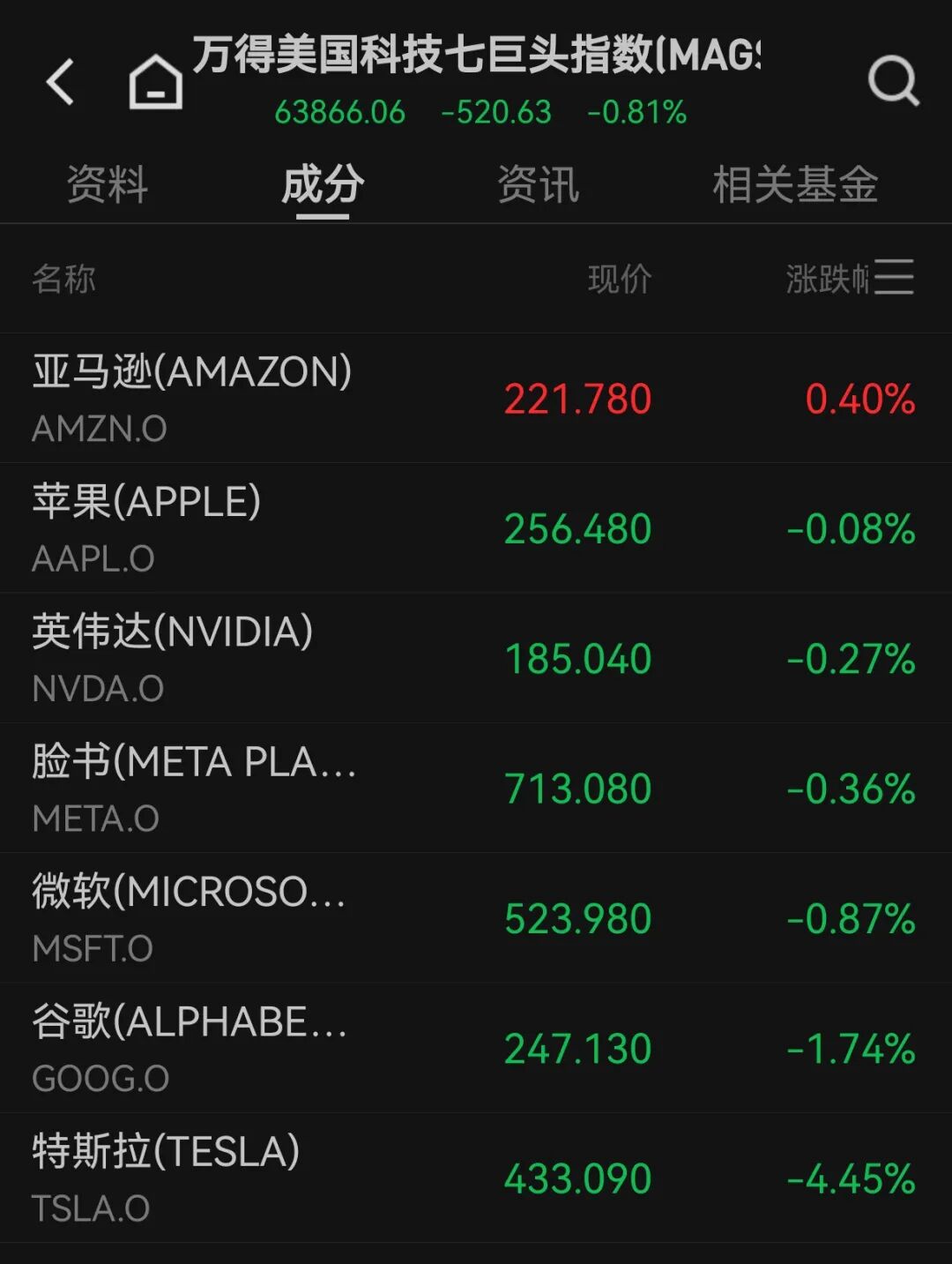 科技板块表现不佳,万得美国科技七巨头指数下跌0.81%。其中特斯拉跌超4%,谷歌-C跌近2%,七巨头中仅亚马逊上涨。